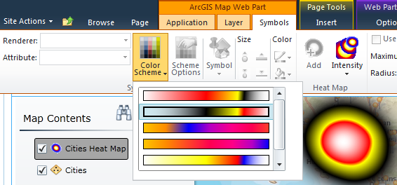 A heat map will be calculated and automatically added to the map. The heat map will also become the selected layer. This will enable the Intensity and Color Scheme buttons: